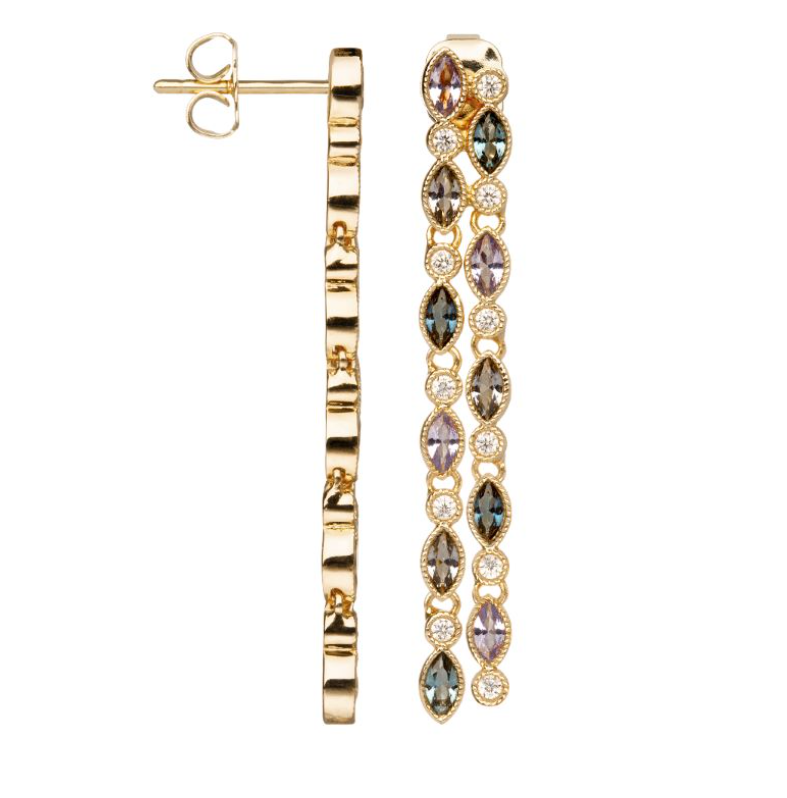 Apportez une touche de raffinement à votre tenue avec ces boucles d’oreilles pendantes en plaqué or 3 microns. Composées de deux lignes parallèles, elles sont sublimées par un enchaînement harmonieux d’oxydes de zirconium bleu en forme de navette et de pierres blanches rondes. L’alternance délicate des couleurs et des formes crée un jeu de lumière élégant à chaque mouvement, faisant de ces boucles d’oreilles le choix parfait pour une soirée ou pour illuminer votre quotidien.